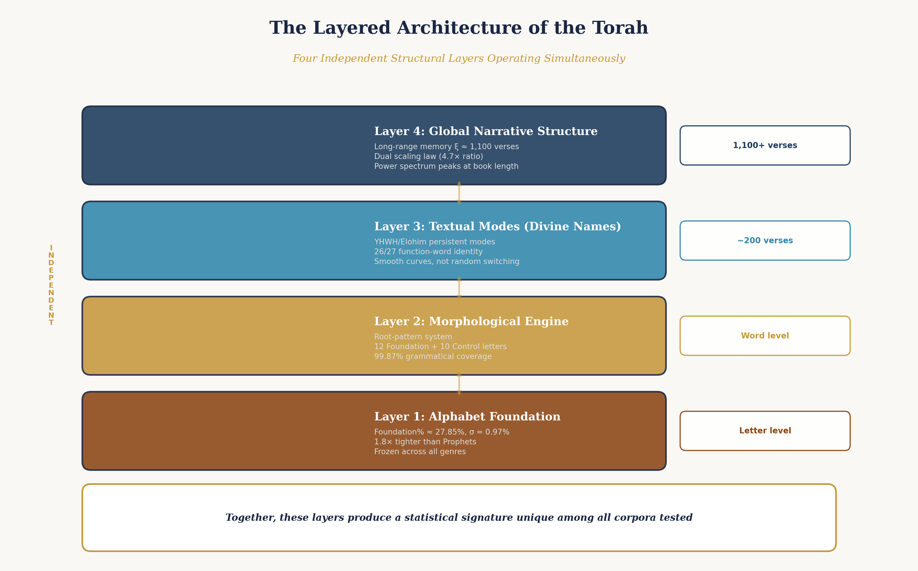 על פני רמות ניתוח מרובות — מאותיות ומורפולוגיה ועד דפוסים דינמיים של שמות אלוהיים וארגון סטטיסטי לטווח רחוק — התורה נראית כמפגינה תכונות של ארכיטקטורה מידעית רבדית המוטמעת בשפה.