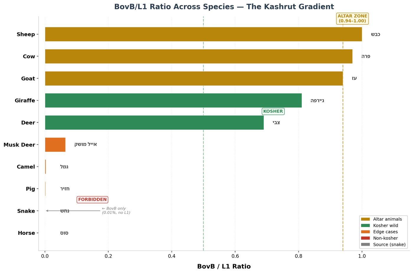 This is a classification that modern science did not know existed until this analysis. Linnaeus identified Ruminantia. The Torah identified Ruminantia 3,100 years earlier. But neither Linnaeus nor any subsequent taxonomist identified the BovB/L1 equilibrium subgroup. The Torah did โ by specifying exactly which animals ascend to the altar.
