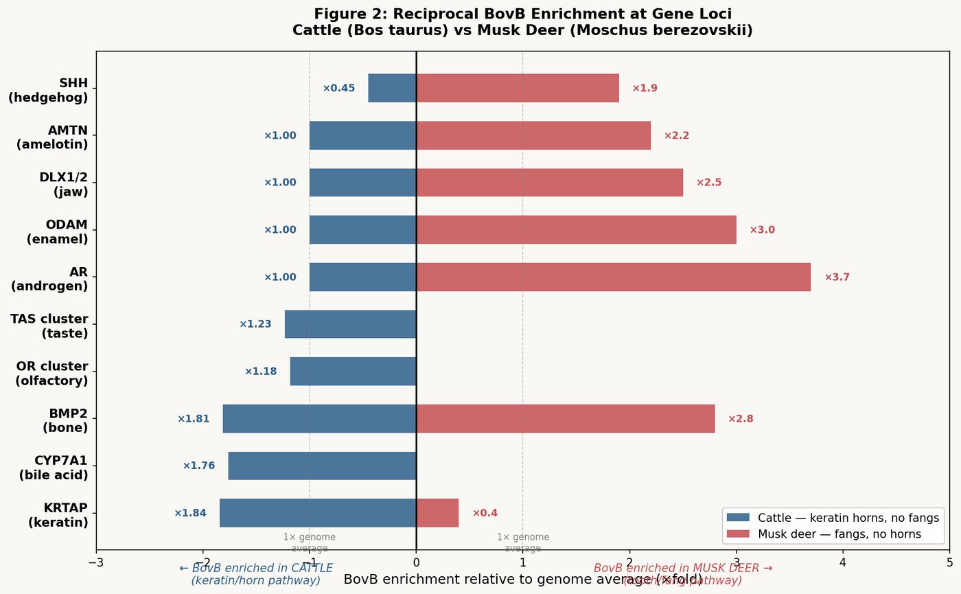 The snake donates the code but barely uses it: in the garter snake (Thamnophis sirtalis), we found only 281 BovB elements totaling 81 kilobases โ a mere 0.01% of its genome. The cow amplifies it 2,151-fold to 568,745 elements spanning 326 megabases โ 12.25% of its genome.