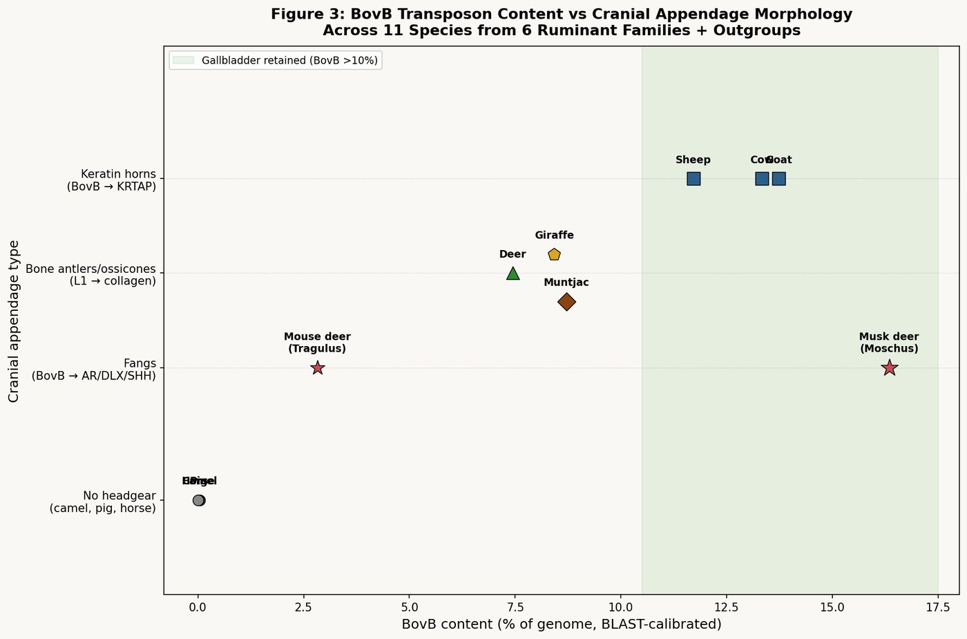 Literature references for cross-species BovB content: Walsh et al. 2013 (PNAS 110:1012-7), Ivancevic et al. 2018 (Genome Biology 19:5).