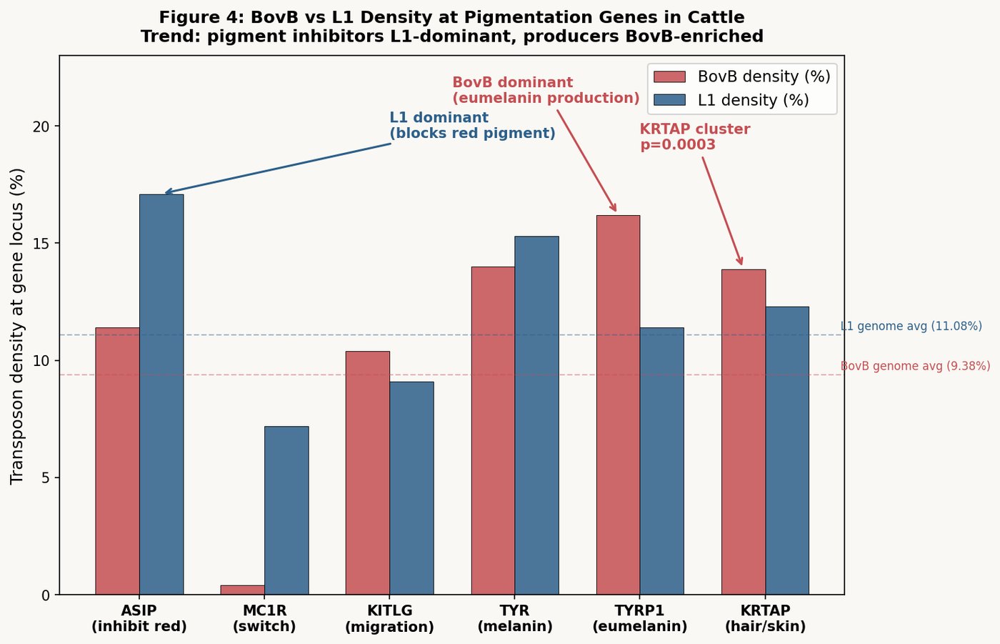 TYR โ the master enzyme that creates melanin pigment โ carries 12.93% BovB within its gene body. TYRP1, which shifts melanin toward red/brown, is enriched 1.20ร above average. KITLG, which signals melanocytes to produce color, is enriched 1.24ร.