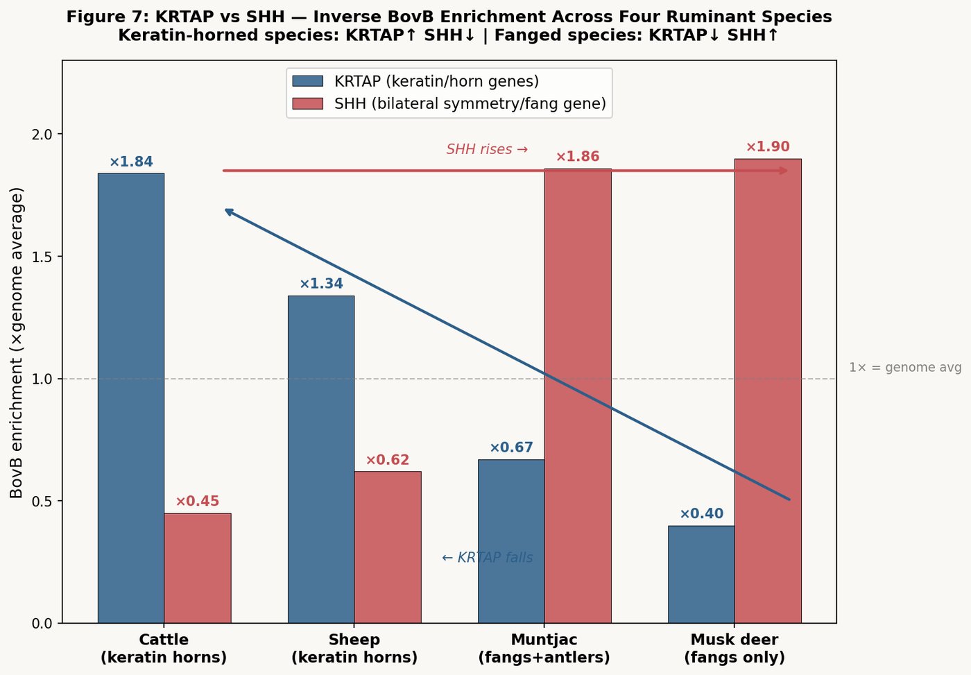 The sheep stands at 1.00 โ perfect equilibrium. The cow at 0.97. The goat at approximately 0.94. All within 6% of unity. The deer, while kosher, overshoots โ its BovB/L1 ratio exceeds 1.0.