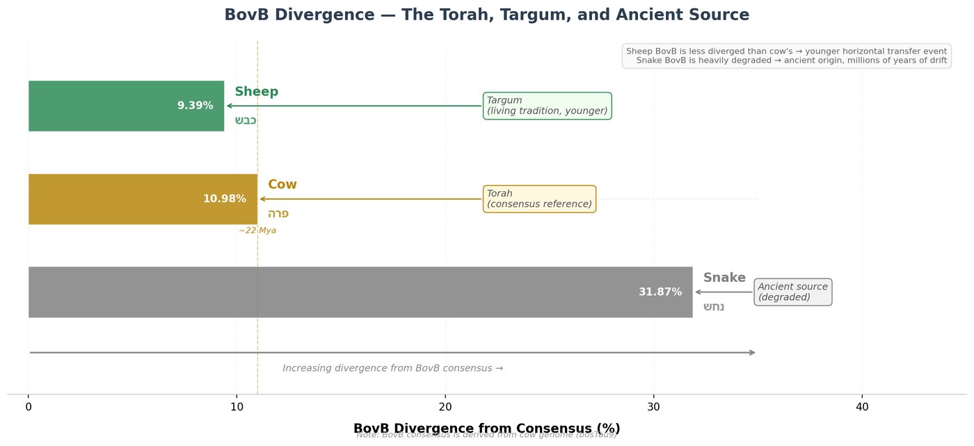 But BovB in the cow is not merely abundant. It is young. The average divergence from consensus is 11.22%, corresponding to roughly 22 million years of activity. In the snake, the same element shows 31.87% divergence โ ancient and degrading. The cow did not passively receive an old element. It took a fragment of snake code and made it thrive.